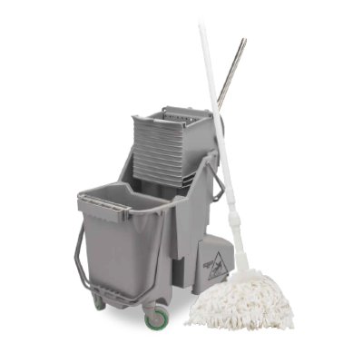 O sistema de Balde duas águas com espremedor e esfregão foi projetado para uso com esfregões BetaMop® ou mops planos dobráveis. O sistema de balde integrado em polipropileno possui dois compartimentos, cada um com 15 litros, além de um espremedor removível.